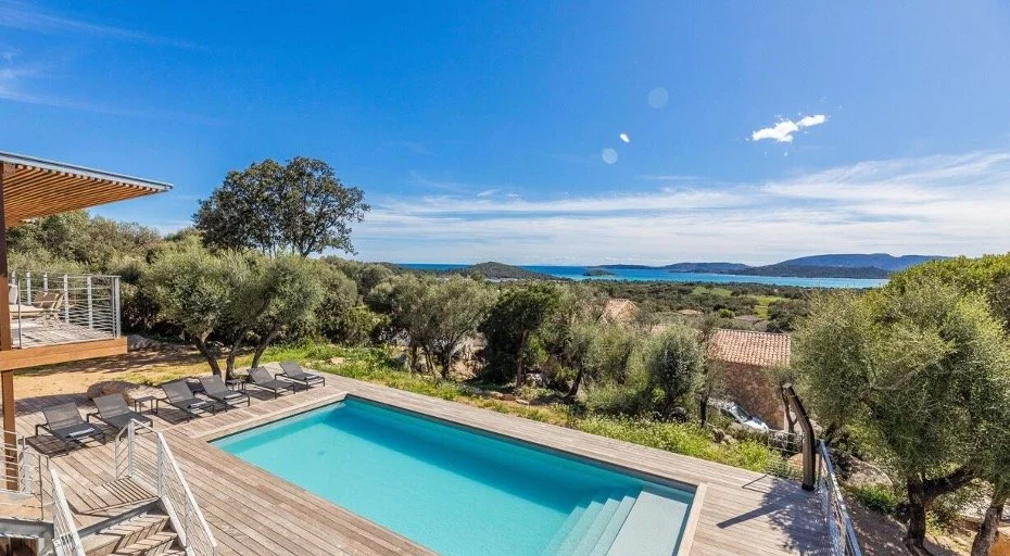Avec ses 9 chambres en suite, ses grandes terrasses baignées de soleil et sa vaste piscine surplombant la côte, la villa constitue un cadre d’exception pour accueillir de grands groupes au cœur des paysages les plus spectaculaires de la Corse du Sud. » -